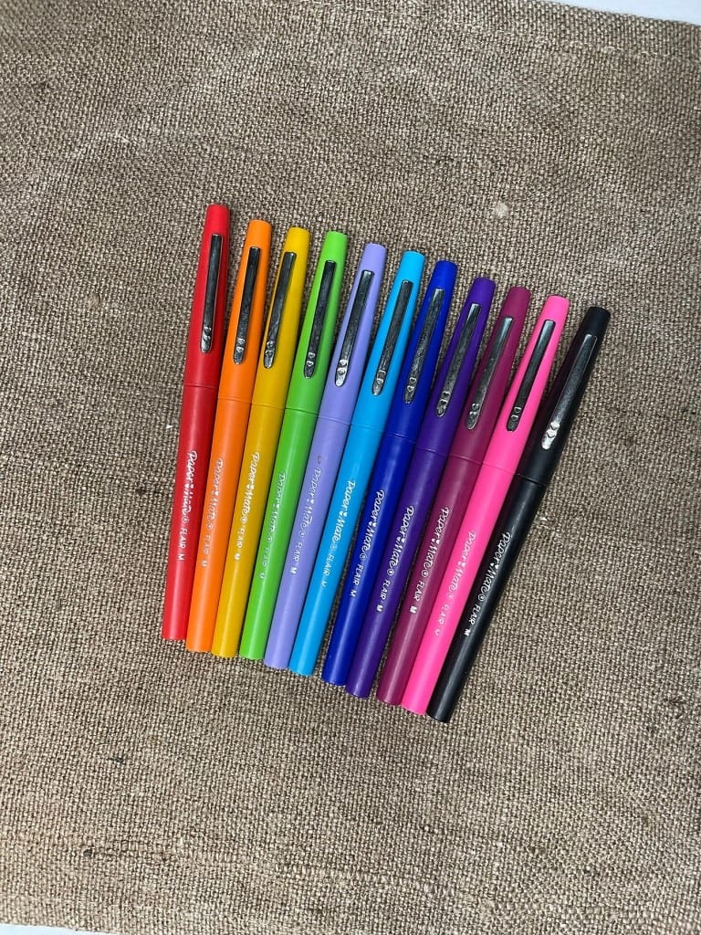Felt tip pens have a great, thick medium tip and are very saturated. I love the juiciness of a Flair tip pen and these have lasted. Unfortunately I left a lid off of my dark green and he had to go to pen heaven, aka the trash can.