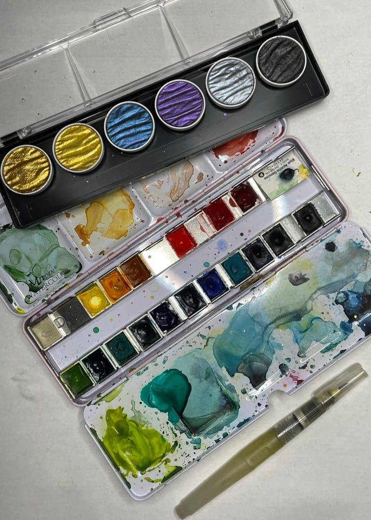 Getting creative on my monthly spread is important to me and I love the layered effect of my Coliro metallic watercolors over the initial watercolor. They are very pigmented and shiny when dry. I used these in every watercolor project I did. I especially love to splatter this paint.