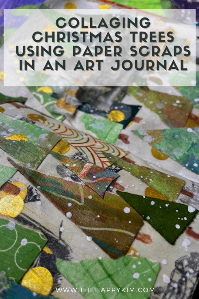 Using paper scraps that are accumulated in the scrap pile, it is simple to collage Christmas trees in an art journal or other art project.